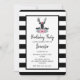 Um convite de aniversário com uma cabeça de cervo preto com grandes galhadas. Linhas geométricas dentro na face do veado adiciona um toque único. Flores cor-de-rosa e folhas verdes de menta formam uma coroa sobre sua cabeça e um buquê floral sob sua cabeça. Um esboço de moutnain também contribui para o sentimento rústico do país. O fundo é um padrão listrado preto e branco.