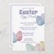 Este convite personalizado apresenta um tema clássico de Caça de Ovos de Páscoa e de lanche. Os ovos de Páscoa decorados em várias cores pastéis e padrões de safra são colocados à volta das bordas. As informações do evento são impressas em uma fonte branca e roxa.