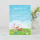 Um convite bonito para um partido da caça do ovo da páscoa que caracteriza uma ilustração dos desenhos animados de um coelho de coelhinho da Páscoa cor-de-rosa que guardara ovos da páscoa brilhantes e coloridos, apreciando a luz do sol do primavera. Há ovos da páscoa e margaridas brancas na grama e nas borboletas que voam através do ar. O texto é inteiramente customizável para sua própria celebração especial da páscoa.
