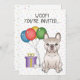 Design do tema de aniversário bonito com a ilustração original de Destei de uma cor de creme bonita para o Bulldog Francês / para o Filhote. Ao lado do cão há balões coloridos de aniversário amarrados num osso de cão e uma caixa de cor roxa e amarela. O fundo tem um padrão lúgubre de confete pastel colorido sobre um fundo branco. Personalize as áreas de texto de exemplo com os detalhes do seu evento.