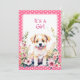 Um doce cachorrinho rodeado por flores cor-de-rosa ilustração aquosa convites para bebês.