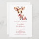 Um convite de aniversário com uma ilustração de um adorável veado bebê. Olhos grandes orelhas com cabeça grande e pequenos galhos castanhos. Vestindo um grande arco vermelho. Ao lado de uma pilha de presentes.