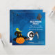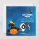 O convite para o Halloween apresenta uma teia de aranha com aranha, um morcego fofo, um fantasma, um jack-o-lanterno num chapéu de bruxa com um lagarto.
