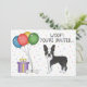 Design do tema de aniversário bonito com a ilustração original de Destei de um lindo cão da raça Boston Terrier, de cor branca e casaco. Ao lado do cão há balões coloridos de aniversário amarrados num osso de cão e uma caixa de cor roxa e amarela. O fundo tem um padrão lúgubre de confete pastel colorido sobre um fundo branco. Personalize as áreas de texto de exemplo com os detalhes do seu evento.