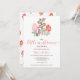 O nosso cogumelo está a caminho! Chamas de fadas de outono, fadas de madeira, convite para chá de fraldas, com pequenos cogumelos bonito e bonitos, em vermelho, rosa, azul, roxo e rosa e um cartaz de madeira que diz chá de fraldas. O chá de fraldas perfeito convida para a sua festa de outono com um tema de fada ou floresta.