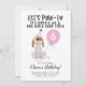 Convite de aniversário de ilustração fofo bonito para o aniversário do seu filho! O cachorro branco e marrom está vestindo um chapéu de festa listrado rosa e branco e segurando um balão rosa. Dentro o balão é um texto editável onde você pode ter a idade da criança impressa. O texto acima diz "Vamos Pawty. Vai ser um cão que vai se divertir." Na parte de baixo há texto mais personalizável para listar as informações da parte, incluindo a data e o local.Este convite para a festa engraçada vai definitivamente ser um sucesso!