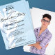Celebre um marco especial com este convite moderno de festa de formatura médica. O design apresenta um grande símbolo de caduceu em um fundo azul suave, representando a profissão médica e de saúde. A tipografia elegante cria um layout sofisticado que é perfeito para graduados em medicina, enfermagem, farmácia ou outras áreas da saúde.