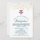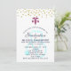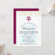 Um convite para uma celebração de formatura em enfermagem. Projetado com pontos de confete dourado falso ao longo da parte superior. Um símbolo de caduceu vermelho arroxeado com as letras R N em cada lado.