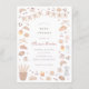 Café bébé baby shower invitations. This french bakery-themed baby shower invite features a hand-painted frame of sweet treats, bread, and coffee. The illustrations include croissants, pan au chocolat, cinnamon rolls, pies, cake, cupcakes, baguettes, cherries, bows, coffee beans, and more. Ideal for a baby is brewing, Parisian patisserie, or coffee shop themed baby shower event. Cards reverse to vertical watercolor stripes in a warm brown color. View the collection linked on this page for matching items or visit our store for more baby shower invitations.