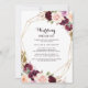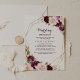 Este convite para o café da manhã floral de burgundy dourado é perfeito para uma família e amigos simples, dia depois do casamento. O design apresenta buquês de flores elegantes, verdes, esbranquiçados, roxos, vermelhos e burlões desenhados à mão, adorando quadros geométricos dourados, classe inspiradora e beleza.