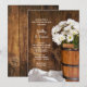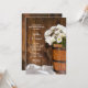 Convide os convidados para celebrar os noivos recém-casados na manhã após a cerimônia de casamento no estilo rancho com o convite casual, porém elegante, para o brunch pós-casamento no estilo country, Wooden Bucket e White Daisies Country Barn. Este convite personalizado rústico e chique para o café da manhã ou almoço após o casamento em uma festa em um celeiro de fazenda apresenta uma encantadora fotografia floral digitalmente aprimorada de um balde de madeira cheio de flores brancas de margarida e um fundo de madeira de celeiro marrom desgastado.