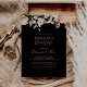 Este convite para o café da manhã de casamento real e formal preto é perfeito para um evento moderno. A design apresenta cor-de-água rosa, pincel e flores brancas elegantes com folhas esmeraldas verdes.