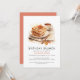 Convites de brunch de aniversário divertidos com uma cena aquosa confortável de uma caneca de café e comida de café da manhã. O reverso é uma cor de terracota coordenadora.