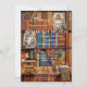 Chá de panela para uma senhora de gato maluco. Este convite caprichoso apresenta prateleiras de livros com gatos e café no estilo retrô. Na parte de trás estão bolinhas.
