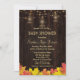 Design de cartão único com um antigo celeiro com lindas lanternas velhas e luzes de cordas como fundo, folhas de queda vintage, bela Tipografia do CHÁ DE FRALDAS. Use a ferramenta Personalizar para adicionar suas informações. Para mais, veja a minha coleção Vintage Fall Wood Old Lanterns.