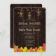 Design de cartão único com um antigo celeiro com lindas lanternas velhas e luzes de cordas como fundo, folhas de queda vintage, bela Tipografia do CHÁ DE PANELA. Use a ferramenta Personalizar para adicionar suas informações. Para mais, veja a minha coleção Vintage Floral Wood Old Lanterns.
