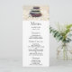 Cartão de cardápio de casamento com uma fotografia com pilhas de rochas sobre si. Cercado por rochas brancas soltas e pequenas flores brancas.