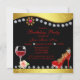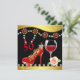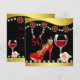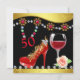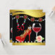 Elegante Calçado Vermelho Personalizado, Vinho e Joias 50º Convite de Aniversário. O design tem borrão colorido, rochas, brilho, flor, vidro de vinho com fundo preto e dourado. Perfeito para meninas que amam calçados, reluzentes e faíscas!