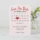 Calendário "salve a data" com coração vermelho em fundo de coração rosa para próximo casamento.