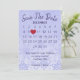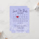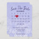 "Salve a Data" calendário com coração vermelho em padrão de floco de neve roxo pastel para próximo casamento.