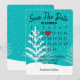 Calendário "Salve a Data" com coração vermelho em aqua com flocos de neve e árvores para o próximo casamento.