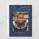 Esse cartão com fotos de graduação minimalista apresenta um simples design com roteiro informal. Na frente, o "Formando" é escrito em uma caligrafia casual através do topo, com uma grande foto abaixo. Na parte inferior, adicione o nome do formando, a escola e o ano de graduação. A tipografia é ouro contra fundo azul marinho. A parte traseira da placa de graduação inclui um modelo opcional para adicionar detalhes da festa de formatura.