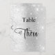 O número da tabela é escrito com um script de estilo elegante com letra manual. Letras negras, um fundo de prata sujo com poeira brilhante falsa, faíscas.