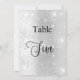 O número da tabela é escrito com um script de estilo elegante com letra manual. Letras negras, um fundo de prata sujo com poeira brilhante falsa, faíscas.