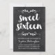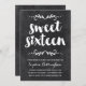Este convite rústico, country-chic para uma doce festa de aniversário de dezesseis apresenta uma bonito caligrafia com roteiro de pincel que diz "Doce dezesseis" e parece que está escrito em giz. O design inclui também floricultura e um fundo de chalkboard.