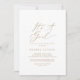 Esta delicada caligrafia dourada é um convite de chá de fraldas feminino é perfeito para um chá de fraldas moderno. A design romântica minimalista apresenta uma magnífica e elegante tipografia amarela ouro champanhe num fundo branco com um aspecto simples e limpo.