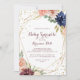 Este convite para o bebê, caligrafia geométrica, é perfeito para um chá de fraldas moderno. O design apresenta uma aquarela desenhada à mão, púrpura, marinho, pincel, burgundy, flores de marinho, folhas verdes e douradas, brilhando como uma elegante estrutura geométrica.