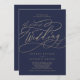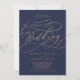 Este convite para casamento virtual de marinho de caligrafia em ouro romântico é perfeito para um casamento simples. O clássico moderno design apresenta espirais de rico e turbilhões brancos com belíssima e elegante tipografia de folha de ouro de champanhe com letra falsa. Nota: Este design não apresenta folha de ouro real. É um gráfico de alta qualidade feito para se parecer com folhas de ouro.