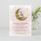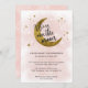 Claro que você está sobre a lua e esperando uma menina! Uma moderna lavagem de cor-de-água cor-de-rosa, ao fundo, com a lua e as estrelas a convite de chá de fraldas de ouro. 'Estamos sobre a lua' está escrito em uma caligrafia na moda.
