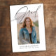 Simple Trendy Calliographic Photo Graduation Invitation apresenta uma foto na frente e duas fotos no verso, além de detalhes de convites para formatura.