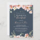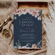 Este convite para o café da manhã floral de rosa de jardim de eucalipto é perfeito para um evento moderno. A design apresenta flores rosa, pinceladas, amarelas, com folhas de eucalipto em fundo azul-marinho escuro.