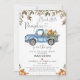 Caminhão de Pumpkin Azul Laranja com Chá de fraldas Cardíaco Convite à queda Doces rapazes Convite ao chá de fraldas com um caminhão azul, várias abóboras, alguma adorável folhagem verde, castanha e um coração alaranjado. O convite para chá de fraldas de carrinho de abóbora deste garoto também apresenta textura falsa de ouro brilhante e é ideal para o chá de fraldas do garoto temático do outono.