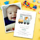 Pequeno dino bonitinho a trabalhar na carrinha de construção, Imprima o seu convidado por este convite de aniversário fofo e espantoso, Personalize com a fotografia do seu pequeno para tornar este convite muito especial