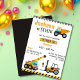 Crie uma festa de aniversário inesquecível com este convite temático de construção envolvente! Perfeito para qualquer jovem construtor que está fazendo sete anos, este convite apresenta um número "7" em negrito combinado com uma ilustração alegre de um caminhão basculante, definindo um tom alegre para a celebração. O nome da criança aniversariante é destacado em uma fonte chamativa e os detalhes da festa são claramente apresentados, com a data e hora enfatizados em laranja e preto impressionantes. Um padrão de fita de construção festiva reveste a parte inferior, garantindo que todas as informações essenciais se destaquem. Veículos de construção adicionais, como um guindaste e uma empilhadeira, são ilustrados na parte inferior, reforçando o tema. Os detalhes sutis do fundo, como o padrão de piso de pneu no topo, ainda vinculam o tema da construção sem sobrecarregar os elementos principais. O verso do convite é preto sólido, proporcionando um acabamento elegante e polido que complementa o design vibrante da frente. Ideal para jovens entusiastas da construção, este convite irá preparar o cenário para uma festa de aniversário cheia de aventura e diversão. Encomende agora para garantir que o aniversário do seu filho seja uma celebração temática de construção inesquecível! Obrigado por visitar. Se tiver alguma dúvida sobre a personalização, por favor me envie uma mensagem aqui ou entre em contato comigo em arteartz0588