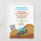 Blue Monster Truck 4.. Convites de Corrida de Aniversário. O convidado tem um caminhão monstro numa colina de terra com uma bandeira branca e preta. Personalize com os detalhes do seu partido.