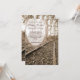 Rustic Country Railroad Track Convites de Casamento com um quadro elegante ao redor do convite de casamento no canto superior e uma cena de paisagem serena com trilhas de trem correndo por árvores em uma floresta. Estas são excelentes de convites para casamento no campo.