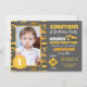 Convite de aniversário de fotos de caminhões de construção giros. Esquema de cor amarelo branco e cinza com veículos de construção, sinais de precaução e padrão de cone de construção em fundo branco. Personalize o texto e a foto!