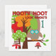 Coruja Primeiro Aniversário T-shirts, fatos-chave, canecas, ímanes, keepsakes, posters, bolsas e mais com uma coruja, muitas árvores, e texto que diz "Hooty Hoot Look Whoo 1"!