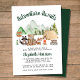 Chá de fraldas rústico e bonito por convite por correio com ilustração de animais florestais (ursos, raposa e guaxinim) com sua tenda e acampamento nas montanhas e florestas e "Aventura Aguarda" e o nome da futura mãe em um roteiro verde de caça escuro. Personalize facilmente o chá por e-mail.