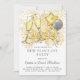 Um convite de véspera de Ano Novo moderno, com óculos de champanhe, balões e brilho com explosões de fogos de artifício. Ouro de platina brilhando no fundo do convite.