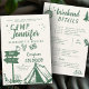 Um modelo de convite de fim de semana moderno, elegante e festa de solteira, com tema de acampamento, com desenhos de uma tenda, anel, mapa, anel, violão e fogo, e um posto de sinais para a data, além de um roteiro manuscrito. Um convite de caligrafia, uma escolha elegante e divertida para um final de semana de glamour de solteira, acampamento, caminhada ou qualquer lugar ao ar livre, em um verde de floresta ao ar livre, suave e tranquilo e num estilo moderno.