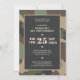 Convide seus convidados de festa de aposentadoria em estilo com este convite do tema de camuflagem militar. Este design apresenta uma fronteira de camo de floresta em khaki, verde-sábio, bronzeado, marrom e preto com um fundo preto para detalhes da sua festa em tipografia bege para que você personalize. Acentuado por estrelas, dá uma aparência patriótica. A parte traseira da placa tem um padrão de camuflagem correspondente. A escolha perfeita para aqueles que se aposentam. Desenhado pela artista ©Susan Coffey.