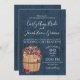 Vinho, cheio de barril de chuva de rosas vermelhas. Design de madeira azul, barril rústico de fundo e convite para casamento de rosas.