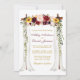 O Cartão de Convite Floral para Casamento Elegante, Canopy Watercolor Burgundy Marsala, inclui belos rosas burgundy, rosas rosa, rosas vermelhas e girassóis. O arco da copa do casamento da madeira inclui vegetação botânica. Dourado Script.