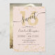Um convite de aniversário moderno, chic e elegante de ouro glitter doce 16, com uma tipografia moderna de 16, brilhando com brilho dourado, sobre um fundo rosado pastel editável. Adicione sua foto atrás ou deixe um fundo rosa. Perfeito para o tema da princesa Doce 16!