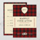 Um conceito de design baseado em uma capa de livro popular e icônico para um cartão de anúncio de convite de casamento com um toque escocês. O fundo de tartã vermelho profundo adiciona um elemento de design elegante para qualquer casamento inspirado na Escócia. Parte da coleção de tartã escocesa.